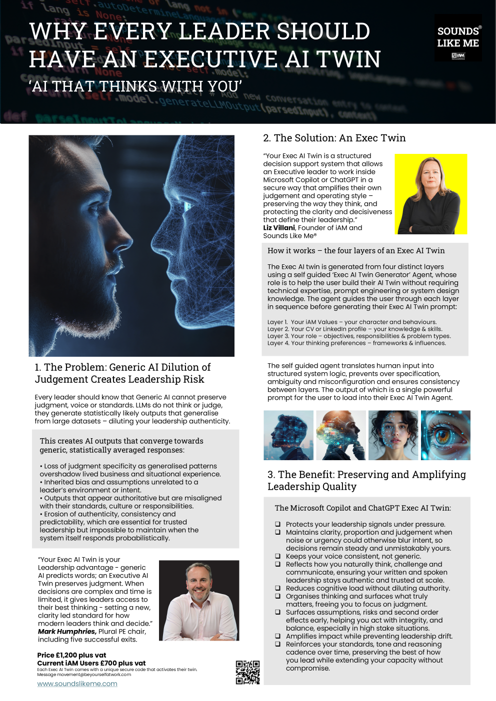 “Your Exec AI Twin is your Leadership advantage - generic AI predicts words; an Executive AI Twin preserves judgment. When decisions are complex and time is limited, it gives leaders access to their best thinking - setting a new, clarity led standard for how modern leaders think and decide.”